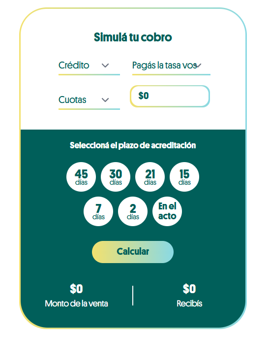 El simulador de cobros es una herramienta digital que está en nuestra web y que te permite calcular automáticamente cuánto dinero vas a recibir por las ventas que realices en tu comercio de acuerdo a diferentes variables: